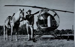 | Rex and his very first helicopter, the Brantley B-2 in 1962. "I was kinda afraid that Goldrush was going to rear-up and into the blade as we took that photo. Goldrush DID NOT like that helicopter!" |